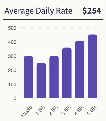 The median ADR for the market is $254. The Average Daily Rate is the highest for 5-bedroom homes ($452) followed by 4 bedrooms and 3 bedrooms at $408 and $359 respectively.