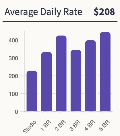 The median ADR for the market is $208. The Average Daily Rate is the highest for 5-bedroom homes ($283) followed by 1-bedrooms and 4 bedrooms at $227 and $148 respectively.