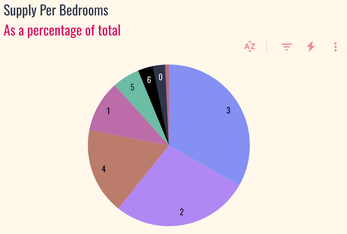 The most popular homes are 3-bedroom homes, comprising 33.04% of inventory. This is followed by 2 and 4-bedroom homes at 27.18% and 17.3% of the total inventory, respectively.