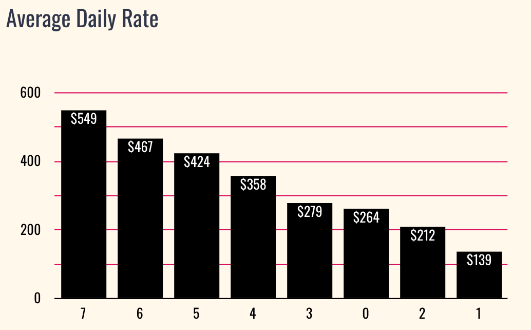 The median ADR for the market is $340.70. The Average Daily Rate is the highest for 7-bedroom homes ($549) followed by 6-bedrooms and 5 bedrooms at $467 and $400 respectively.