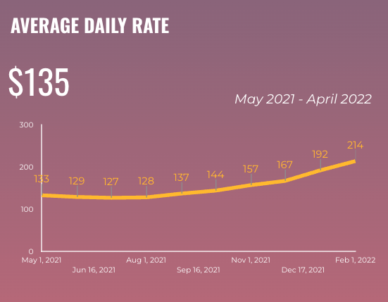 Throughout the year, the rate fluctuates by $76 from that average with the highest Average Daily in February of 2022 ($214) and the lowest in June ($127).