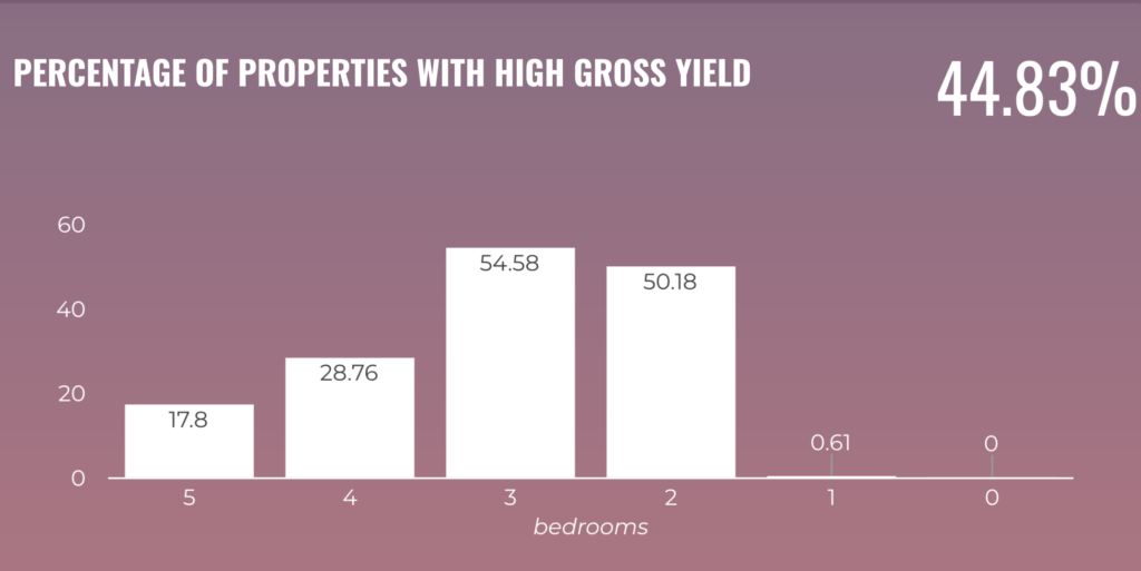Chalet’s research shows that 5-bedroom homes have the highest percentage of homes in high yield territory (54.58%) therefore could be a good strategy for this market. Studios do not have enough samples to be considered (not enough active listings for sale).