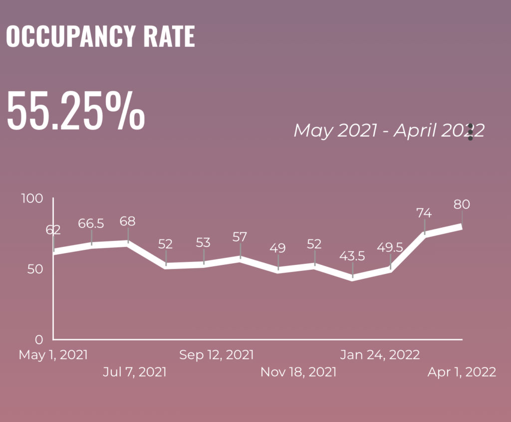 The lowest occupancy rate was in January (43%) and the highest was in March (80%). Drop-in occupancy rates in the Spring of 2021 can be partially explained by a surge in COVID cases.