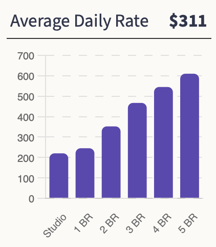 The median ADR for the market is $310.58. The Average Daily Rate is the highest for 5-bedroom homes ($610) followed by 4-bedrooms and 3 bedrooms at $545 and $467 respectively.
