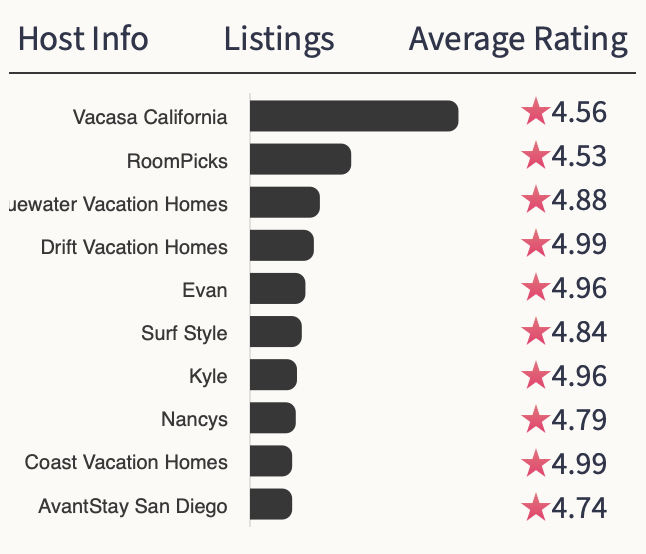 Property management firms dominate the market. The largest host is Vacasa with 4.56% of the total inventory and an average review of 4.46 ⭐️s .
