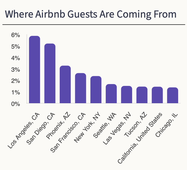 The majority of the guests in San Diego come from California and are within driving distance. 6%% of all guests are from Los Angeles followed by San Diego with 5%.