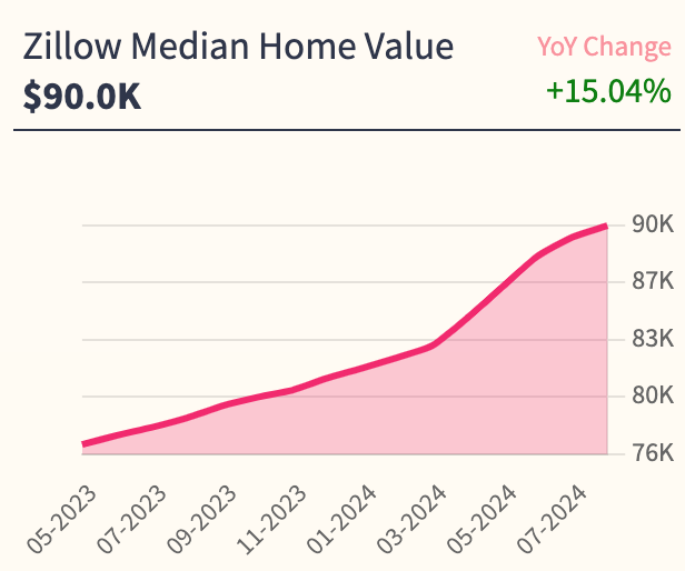 This zip code covers the East Side and Blue Valley areas, which have seen gradual improvement in infrastructure and community initiatives. The gross yield here is a robust 23%, with annual revenue of $21,080, making it a profitable option for investors. With the lowest Zillow home value on this list at $90.1K, this area presents an affordable opportunity for those looking to maximize their returns. The continued investment in neighborhood revitalization is driving increased interest and could lead to higher property values over time.