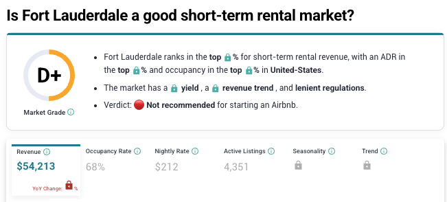 In Fort Lauderdale, Airbtics’ dashboard (12 months through mid-2025) shows a median occupancy of 68%, leading to about $54K in median annual revenue.
