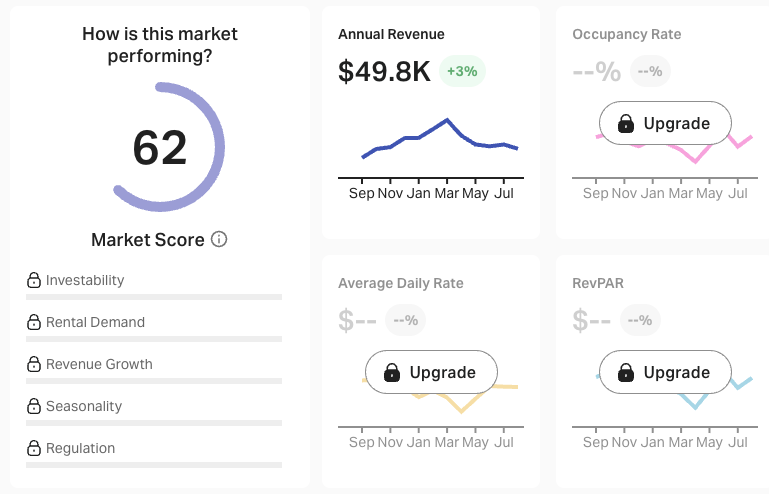 The core product, MarketMinder, is a freemium model which provides city-level metrics like revenue, active listings, minimum stay & amenities information, as well as a proprietary “Market Score” for investability. Most market-level stats are not available for free on AirDNA’s site, including full access to historical data and granular filters that require a paid subscription. Individual monthly plans start at $99 (discounts available for annual plans).