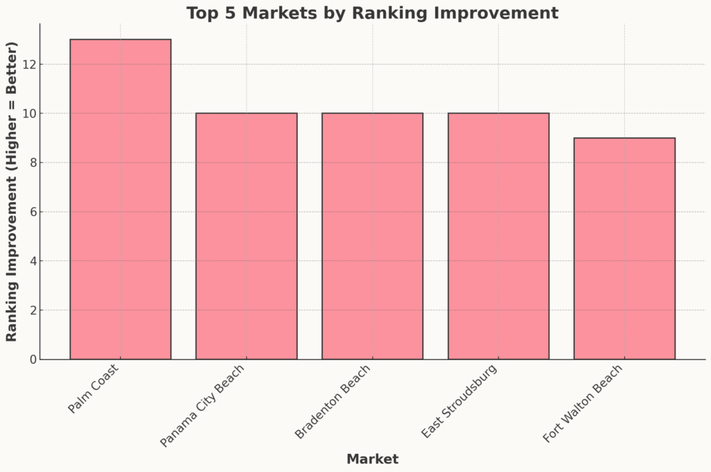 - Panama City Beach: Improved by 10 spots (ranked 32nd as of March 2025)