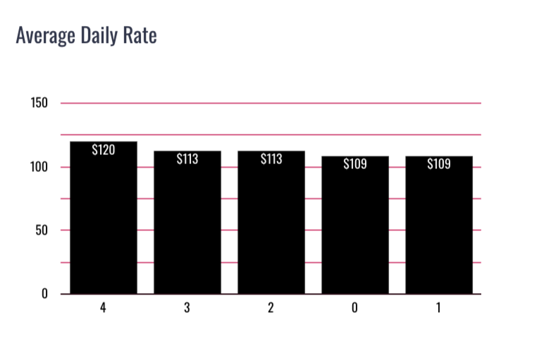 The median ADR for the market is $183.60. The Average Daily Rate is the highest for 4-bedroom homes ($120) followed by 3-bedrooms and 2 bedrooms at $113 and $113 respectively.