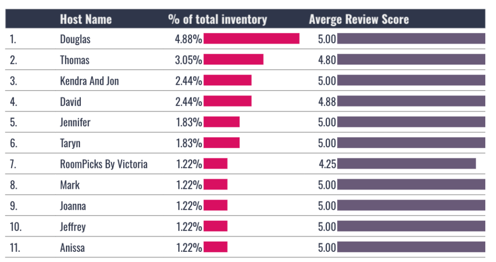 The market is not dominated by property management firms. The largest host is Douglas with 4.88% of the total inventory and an average review of 5.00 ⭐️s .