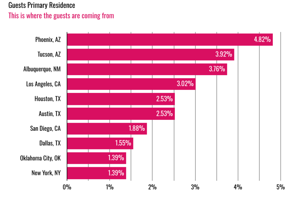 The majority of the guests come from outside of New Mexico. 4.82% of all guests are from Phoenix followed by Tucson with 3.92%.