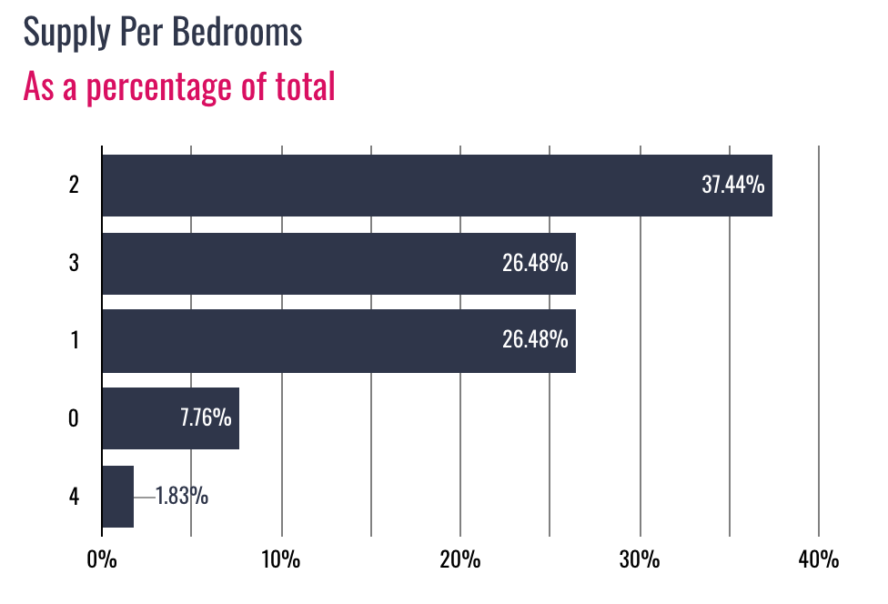 The most popular homes are 2-bedroom homes, comprising 37.44% of inventory. This is followed by 3 and 1-bedroom homes at 26.48% and 26.48% of the total inventory, respectively.