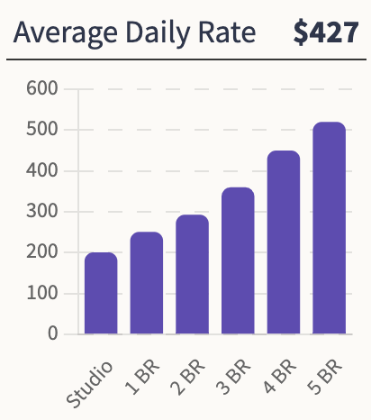 The median ADR for the market is $427. The Average Daily Rate is the highest for 5-bedroom homes ($283) followed by 4-bedrooms and 3 bedrooms at $227 and $148 respectively.