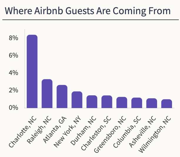 The majority of the guests in Charlotte come from North Carolina and are within driving distance. 8.20% of all guests are from Charlotte followed by Raleigh with 3.60%.