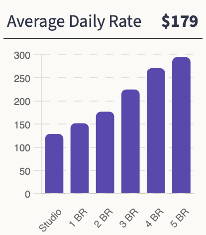 The median ADR for the market is $179. The Average Daily Rate is the highest for 5-bedroom homes $295, followed by 4-bedrooms and 3 bedrooms at $271 and $225 respectively.