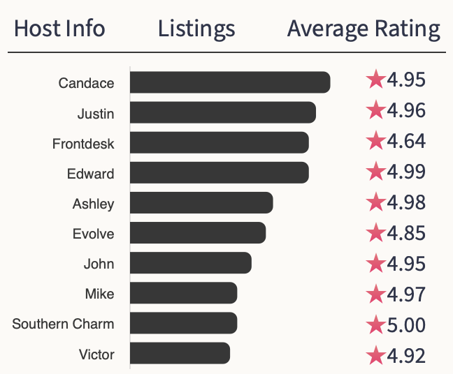 The market is not dominated by property management firms. The largest host is Candace with 4.95% of the total inventory and an average review of 4.77⭐️s .