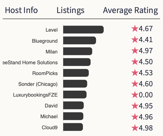 The market is dominated by property management firms. The largest host is Level with 4.67% of the total inventory and an average review of 4.65⭐️s .