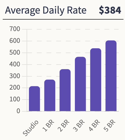The median ADR for the market is $384. The Average Daily Rate is the highest for 5-bedroom homes $605, followed by 4-bedrooms and 3 bedrooms at $538 and $465 respectively.