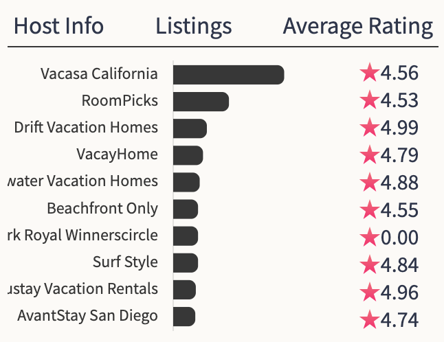 The market is dominated by property management firms. The largest host is Vacasa California with 4.56% of the total inventory and an average review of 4.77⭐️s .