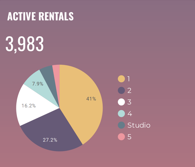 There are 3983 active rentals in San Diego. Almost 68% of all listings are 1 and 2-bedrooms.