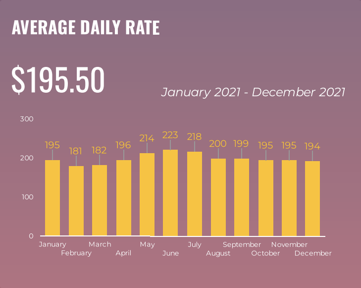 Throughout the year, the rate fluctuates by $24 from that average with the highest Average Daily in June ($223) and the lowest in February ($181).