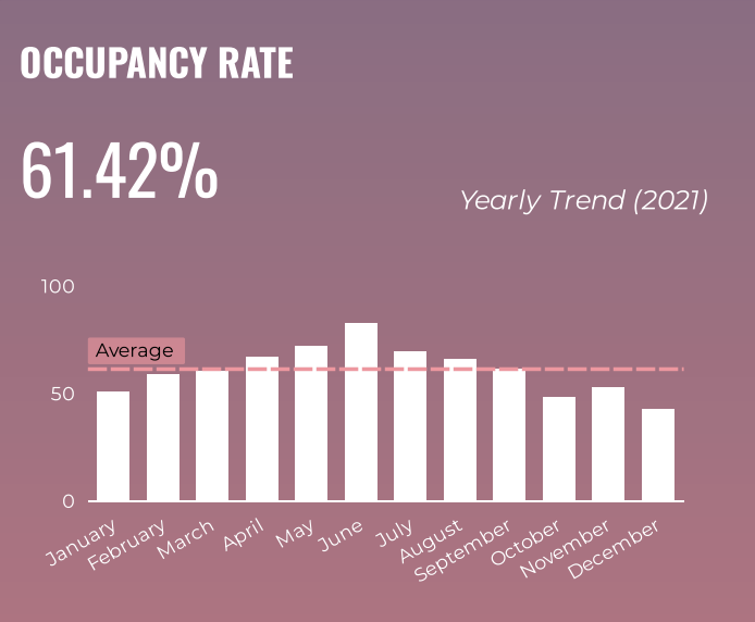 The lowest occupancy rate was in December (43%) and the highest was in June (83%). Drop-in occupancy rates in January and December of 2021 can be partially explained by a surge in COVID cases.