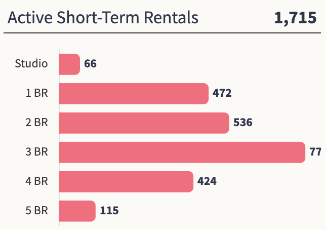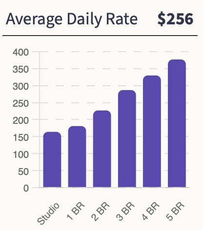 The median ADR for the market is $256. The Average Daily Rate is the highest for 5-bedroom homes ($377) followed by 4-bedrooms and 3 bedrooms at $330 and $287 respectively.