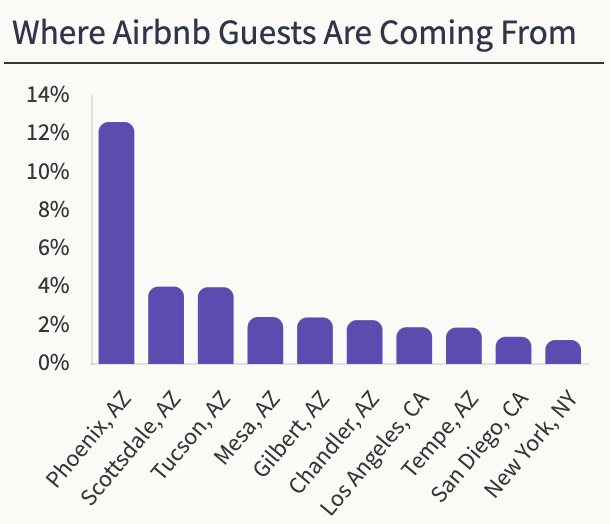 The majority of the guests come from inside of Arizona. 13.00% of all guests are from Phoenix followed by Scottsdale with 4.53%.