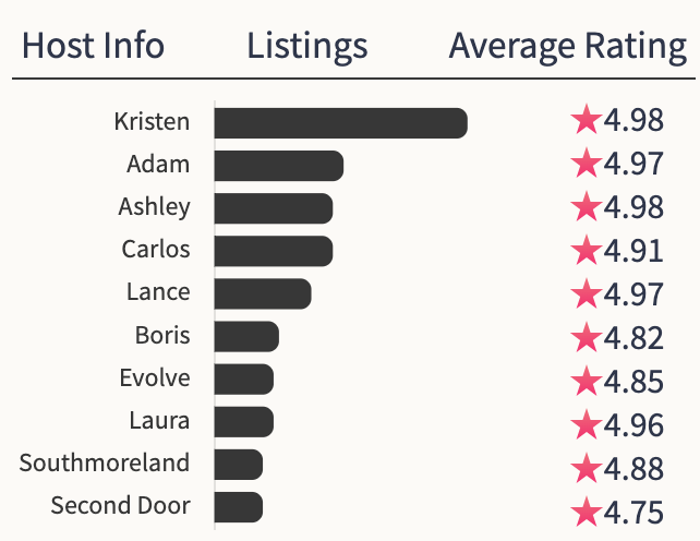 The market is not dominated by property management firms. The largest host is Kristen with 4.98% of the total inventory and an average review of 4.77⭐️s .