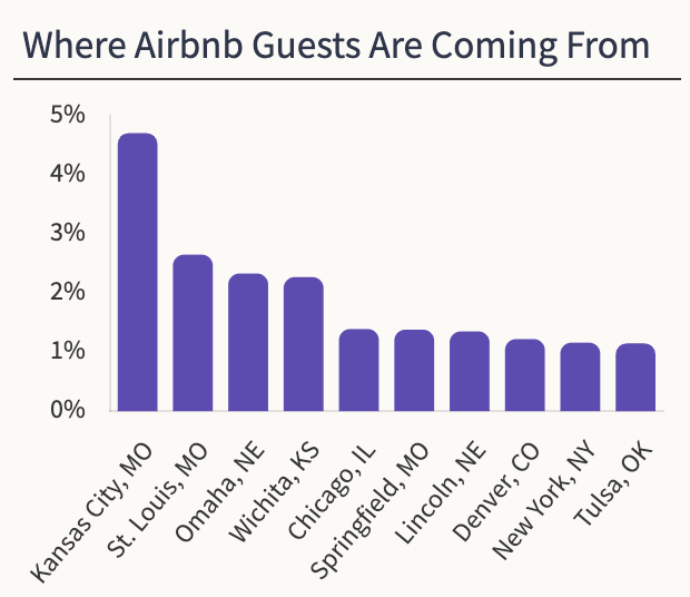 The majority of the guests in Kansas City come from Missouri and are within driving distance. 4.80% of all guests are from Kansas City followed by St.Louis with 2.50%.