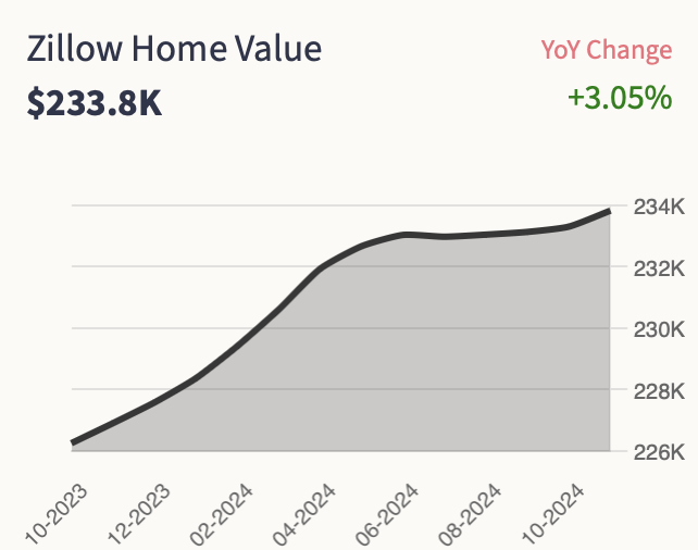 As of January of 2025, Homes in Kansas City have appreciated by 3.05%. The median home value in Kansas City is $233,800 as reported by Zillow. This figure highlights the city’s robust real estate market and the potential for long-term property appreciation.