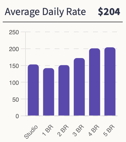 The median ADR for the market is $204. The Average Daily Rate is the highest for 5-bedroom homes $204, followed by 4-bedrooms and 3 bedrooms at $201 and $172 respectively.