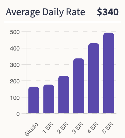 AS of July 2025, the median ADR for the market is $340. The Average Daily Rate is the highest for 4 bedroom homes $430 followed by 3-bedrooms at $337.
