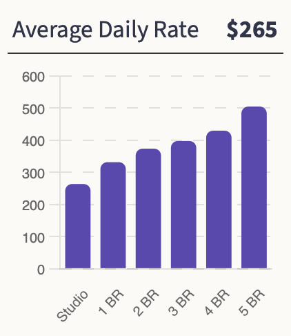 The median ADR for the market is $265. The Average Daily Rate is the highest for 5 bedroom homes ($505) followed by 4-bedrooms and 3 bedrooms at $430 and $398 respectively.