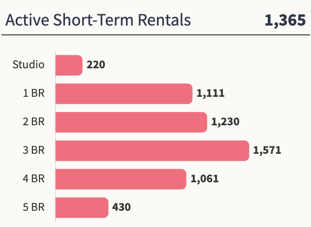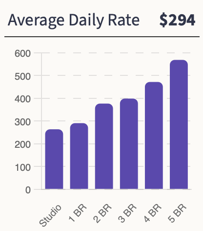 The median ADR for the market is $294. The Average Daily Rate is the highest for 5-bedroom homes ($580) followed by 4-bedrooms and 3 bedrooms at $480 and $400 respectively.