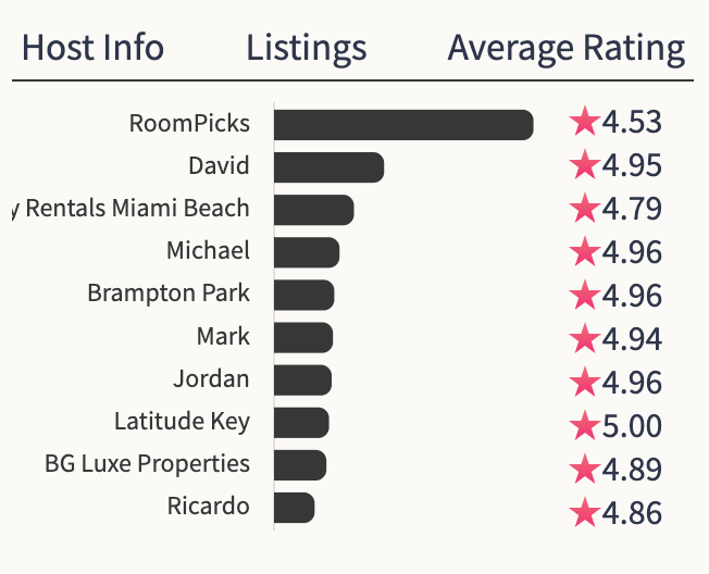The market is dominated by property management firms. The largest host is RoomPicks with 4.53% of the total inventory and an average review of 4.90 ⭐️s .