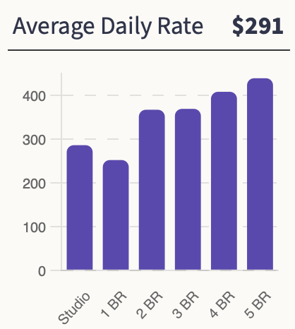 The median ADR for the market is $291. The Average Daily Rate is the highest for 5 bedroom homes ($439) followed by 4-bedrooms and 2 bedrooms at $408 and $367 respectively.
