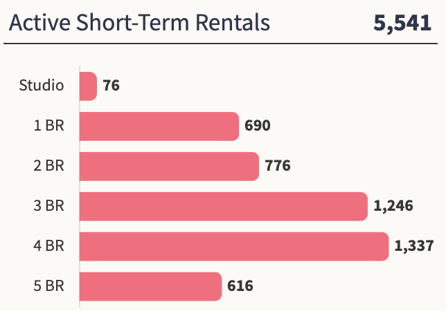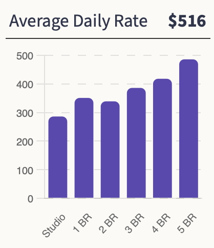 The median ADR for the market is $516. The Average Daily Rate is the highest for 7-bedroom homes ($607) followed by 6-bedrooms and 5 bedrooms at $548 and $442 respectively.