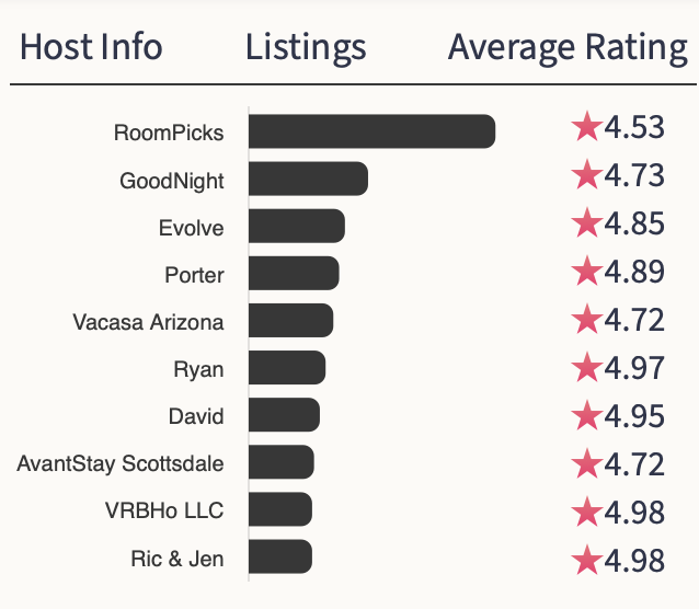The market is dominated by property management firms. The largest host is RoomPicks with 4.53% of the total inventory and an average review of 4.5 ⭐️s .