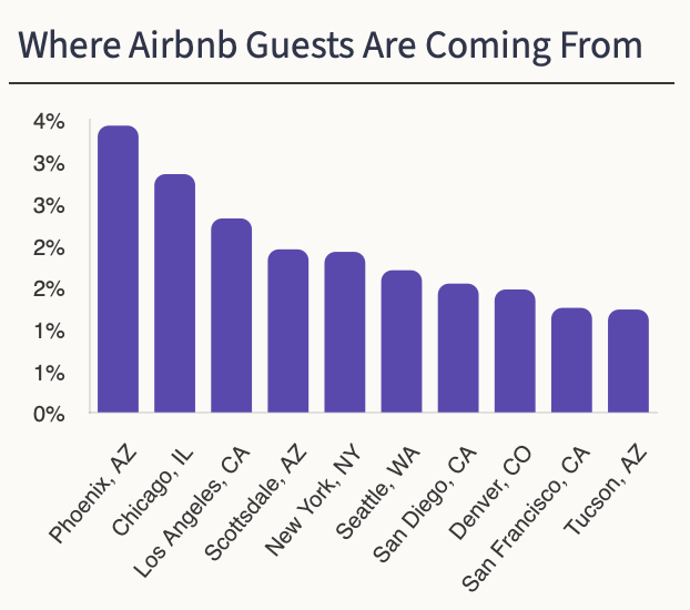The majority of the guests come from inside of Arizona. 3.43% of all guests are from Phoenix followed by Chicago with 2.85%.
