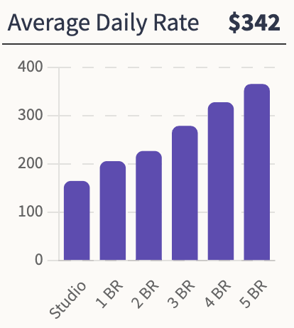 The median ADR for the market is $342. The Average Daily Rate is the highest for 5-bedroom homes ($366) followed by 4-bedrooms and 3 bedrooms at $328 and $279 respectively.