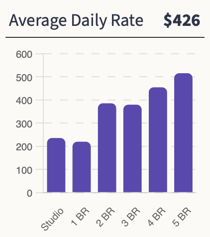 The median ADR for the market is $426. The Average Daily Rate is the highest for 5-bedroom homes $507, followed by 4-bedrooms and 3 bedrooms at $458 and $381 respectively.