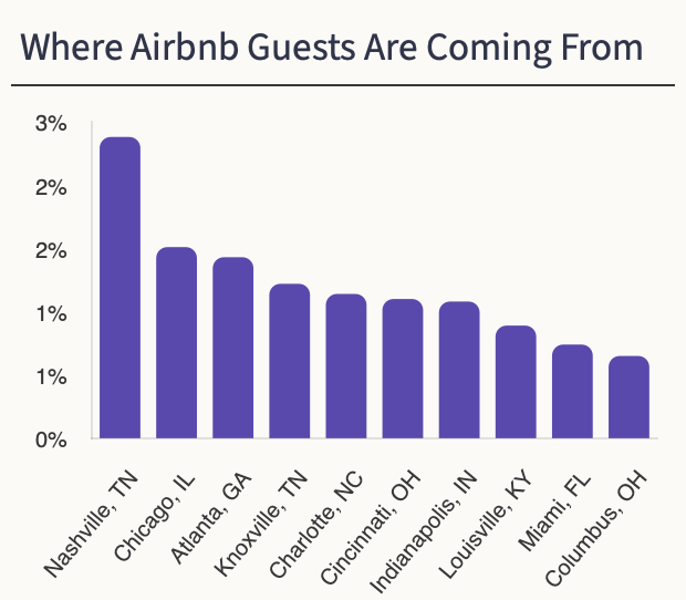 The majority of the guests in Sevierville come from Tennessee and are within driving distance. 2.85% of all guests are from Nashville followed by Chicago with 2%.